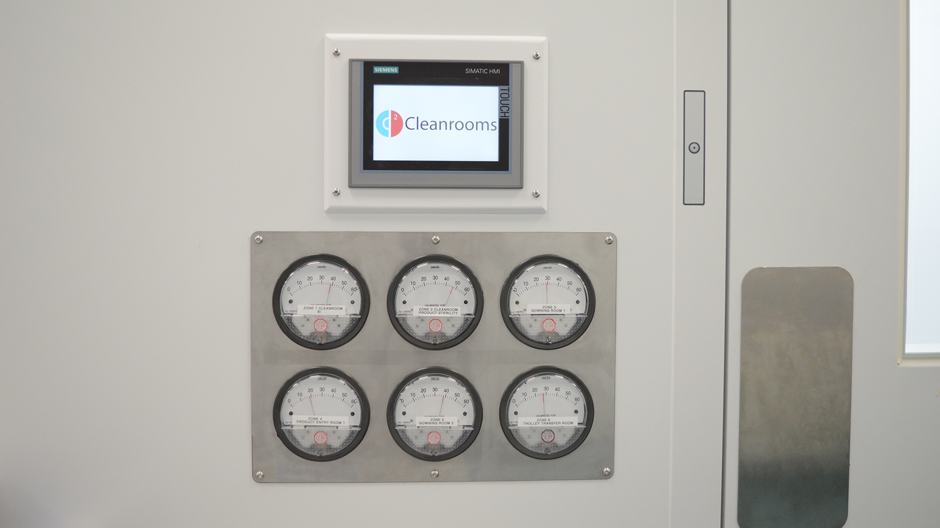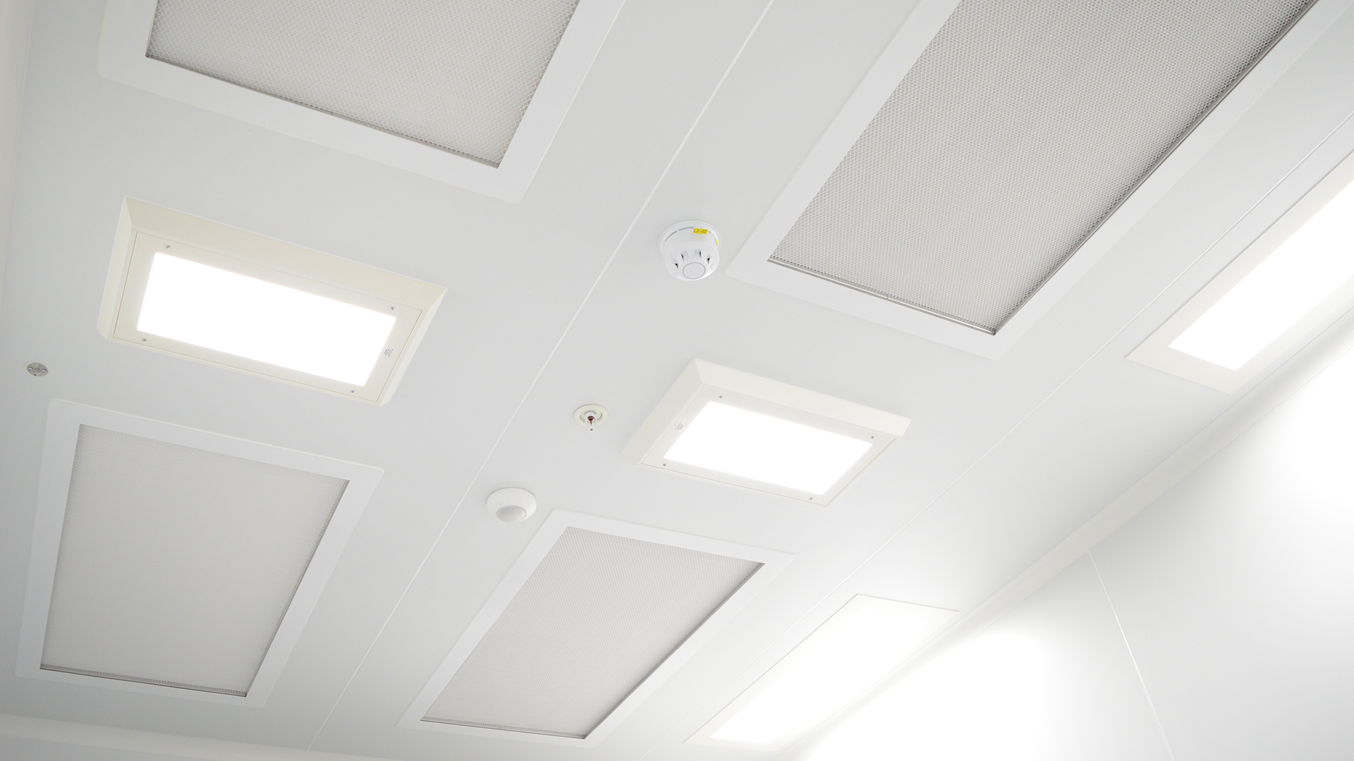 The cleanroom was designed with EU GMP compliant features such as in-duct UV disinfection, interlocks on both materials and people transfer, an antibacterial coved vinyl floor and an ECO control system with alarm function and batch control.