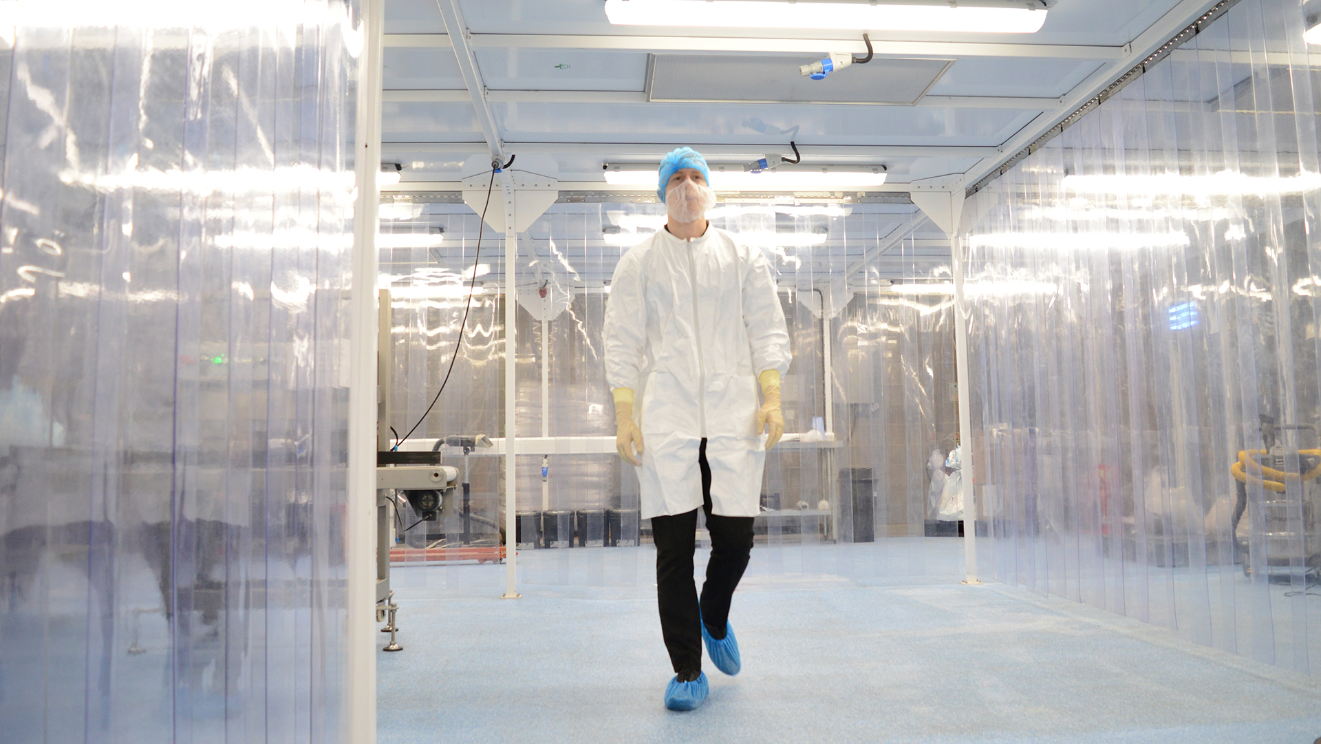 Split into bays, the cleanroom uses softwall PVC curtains to separate production stages whilst facilitating the movement of people and materials along the production line. To promote the correct implementation of gowning procedures a small change area was created, incorporating storage for consumables and outdoor clothing.