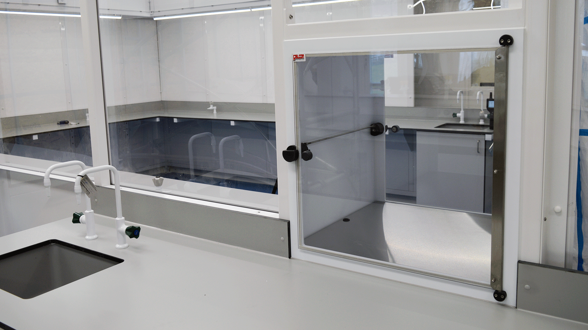 The cleanroom features air conditioning, as well as integrated Trespa benching with integrated lab sinks and a transfer bench from goods to main areas to facilitate easy transfer.